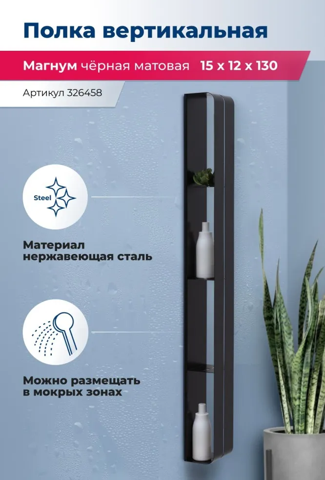 Полка Aquanet Магнум H , вертикальная - идеальное решение для хранения вещей и аксессуаров в ванной комнате. Она состоит из трех полочек и вертикального каркаса без острых краев и углов. Легкий монтаж полочки для ванной обусловлен идущей в комплекте схемы для точной разметки. Материал настенной полки - нержавеющая сталь толщиной 1,5 мм. Благодаря скрытым креплениям и материалу, полку можно размещать даже в мокрых зонах ванной комнаты без опасений за ее прочность и сохранность.