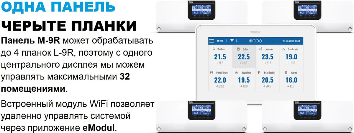 • контроль и изменение температуры воздуха максимально в 32-х помещениях (в случае совместного подключения 4-х контроллеров TECH L-9 R);