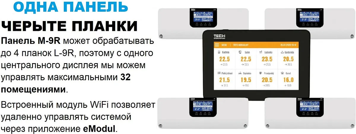 Проводной выносной контроллер со встроенным интернет-модулем TECH M-9 R является элементом расширения проводной-беспроводной системы для напольного и/или радиаторного отопления TECH L-9 R.