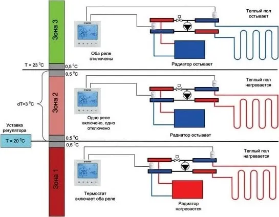 Если температура в помещении слишком низкая, то термостат, чтобы нагреть его максимально быстро, задействует две системы: и теплый пол, и радиаторы. Когда температура становится комфортной, термостат отключает радиаторы и поддерживает температуру только при помощи теплого пола. Если температура продолжает расти и превышает комфортную, термостат отключает систему теплого пола. Включение систем происходит в обратной последовательности.