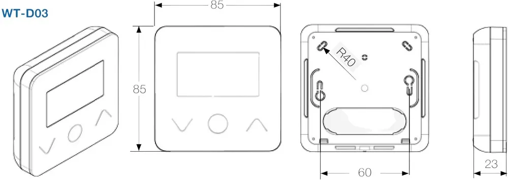 WT-D03 BAT Электронный комнатный термостат со стеклянным ЖК-дисплеем для различных систем отопления и охлаждения. Диапазон регулирования: 5 - 35 °C. Регулируемый гистерезис 0,2 - 3,0 °C или ПИ с циклами различной длительности.