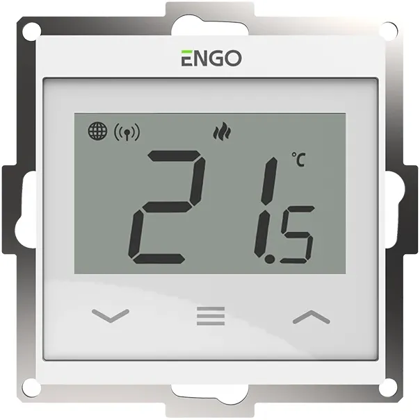Терморегулятор для монтажа в рамку 55×55 мм. Предназначен для управления поверхностным нагревом, характеризующимся высокой тепловой инерцией. Он также может управлять любым другим типом отопления, а также системами охлаждения – в соответствии с потребностями и настройками пользователя. Встроенный модуль Wi-Fi позволяет легко установить и эксплуатировать систему отопления с помощью мобильного приложения ENGO Smart.