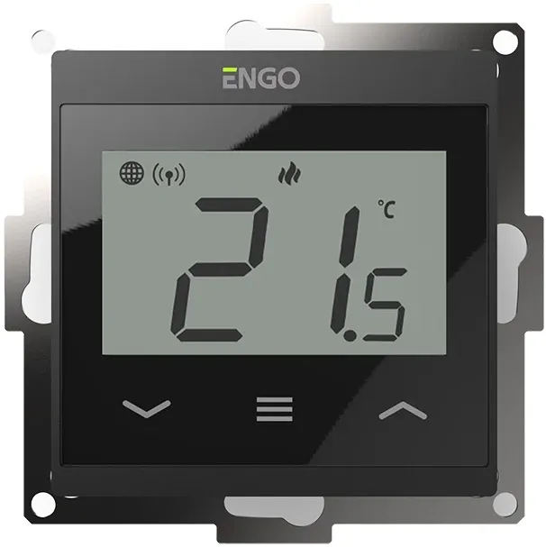 Терморегулятор для монтажа в рамку 55×55 мм. Предназначен для управления поверхностным нагревом, характеризующимся высокой тепловой инерцией. Он также может управлять любым другим типом отопления, а также системами охлаждения – в соответствии с потребностями и настройками пользователя. Встроенный модуль Wi-Fi позволяет легко установить и эксплуатировать систему отопления с помощью мобильного приложения ENGO Smart.
