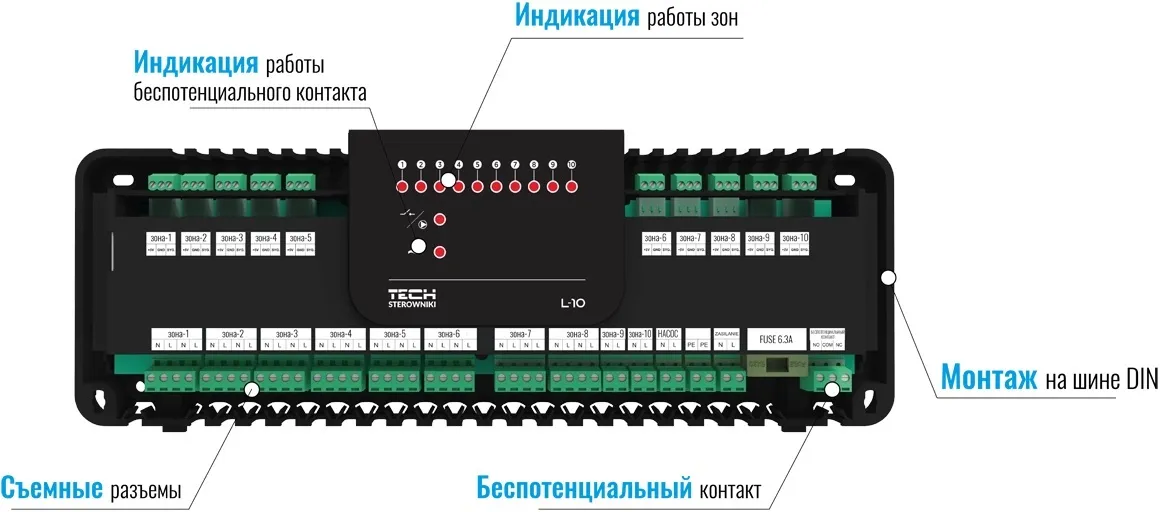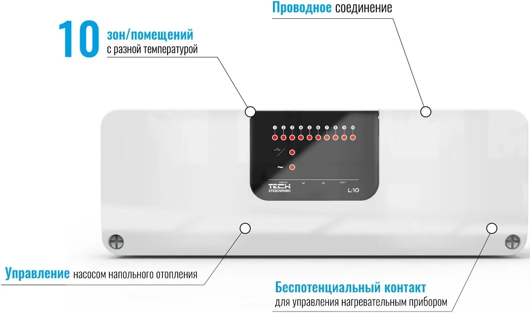 Монтажная планка TECH L-10 – это контроллер, который на основе сигнала от комнатных терморегуляторов управляет работой термоэлектрических приводов, расположенных на распределительном коллекторе. Данный контроллер является проводным, т.е. передача сигнала, а также питание контроллера происходит по проводам.