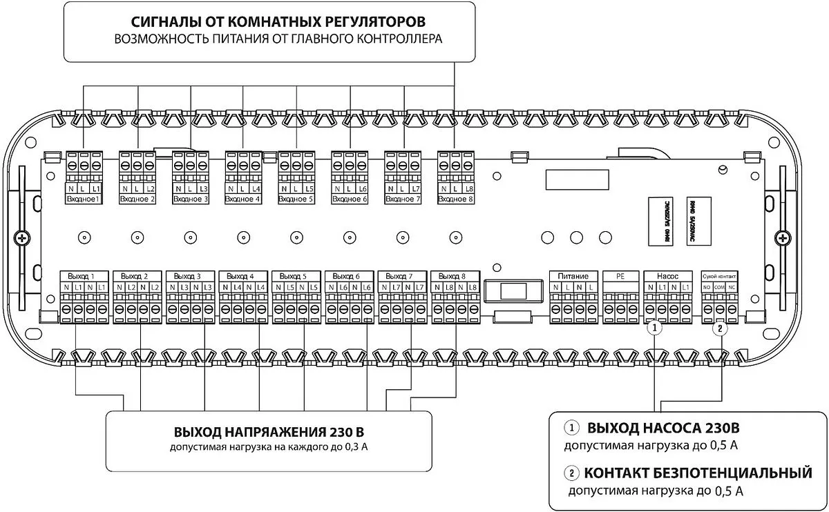 Максимальное количество обслуживаемых термоэлектрических приводов в одной зоне зависит от мощности используемого привода. Суммарная нагрузка приводов для одной зоны не должна превышать 66 Вт.