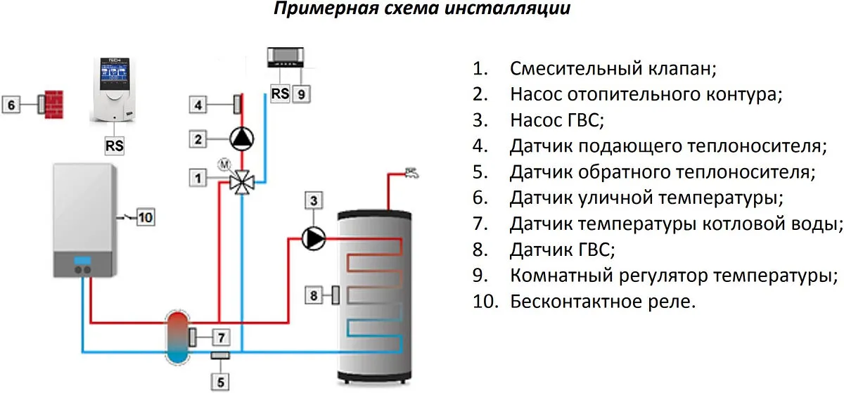 - возможность работы с комнатным регулятором со связью RS или двухпозиционным