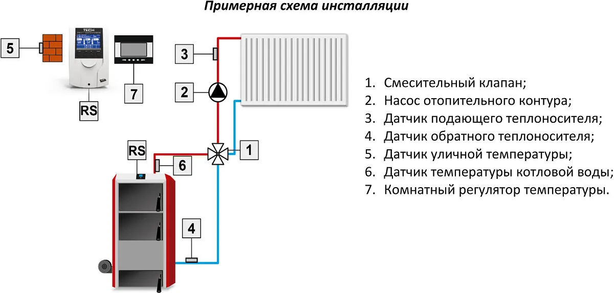 - Возможность работы с комнатным регулятором со связью RS или двухпозиционным регулятором