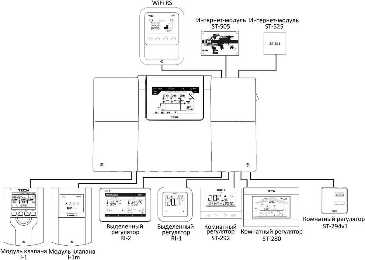 - возможность подключения 2-х дополнительных модулей управления смесительным клапаном TECH i-1 или TECH i-1m