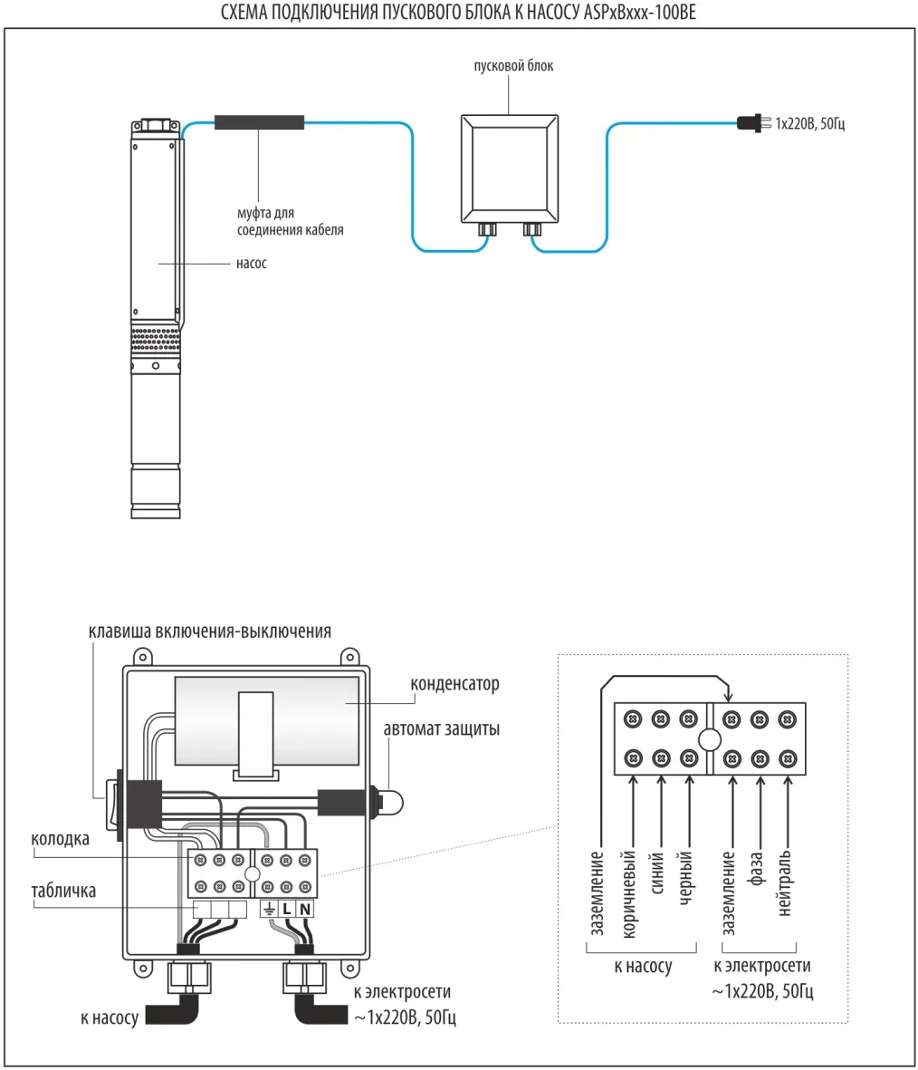 Пусковой блок необходим для работы однофазных погружных насосов/электродвигателей, не имеющих встроенного конденсатора. Без пускового блока эксплуатация таких насосов/электродвигателей технически невозможна.