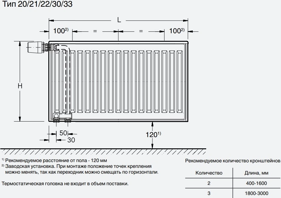 ДОПОЛНИТЕЛЬНАЯ ИНФОРМАЦИЯДля установки радиатора на стену требуется кронштейн K15.4300 - 3шт. Для установки радиатора на напольные кронштейны требуется кронштейн K11.3379300 - 3 шт. или кронштейн K11.9300 - 3 шт.