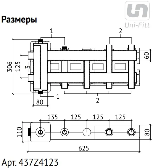 Характеристики товара Распределительный коллектор 3 контура с гидрострелкой 1¼"н x 1"н Uni-fitt 437Z4123