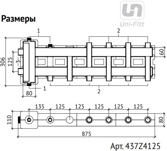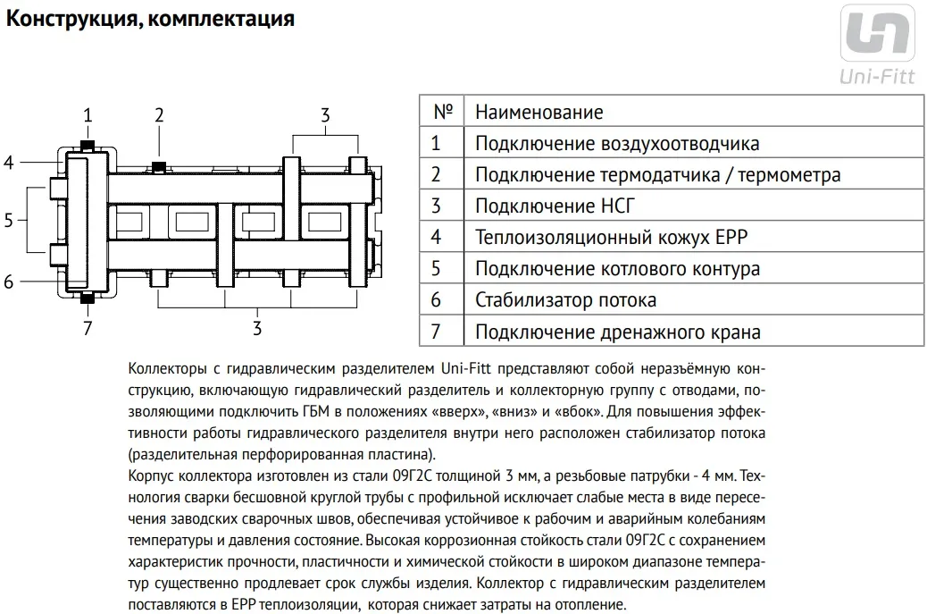 Характеристики товара Распределительный коллектор 5 контуров с гидрострелкой 1¼"н x 1"н Uni-fitt 437Z4125