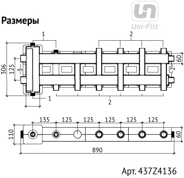 Характеристики товара Распределительный коллектор 6 контуров с гидрострелкой 1¼"н x 1"н Uni-fitt 437Z4136