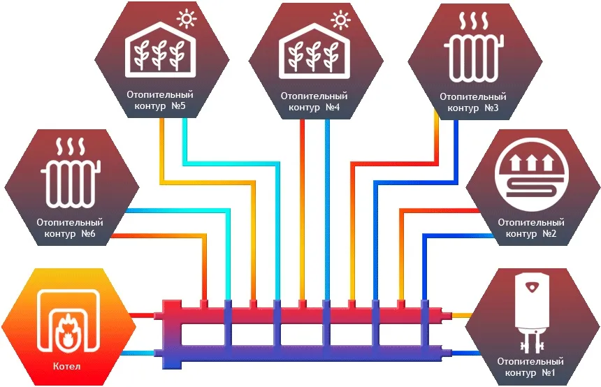 Характеристики товара Распределительный коллектор 6 контуров с гидрострелкой 1¼"н x 1"н Север-R-М6 1945071