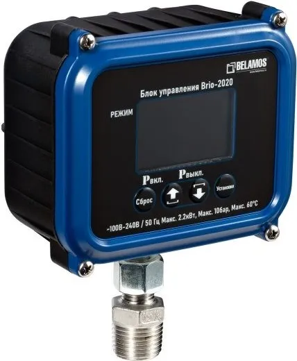 Блок управления контролирует работу насоса в автоматическом режим в заданном диапазоне давления. В случае падения давления ниже минимального блок включает насос, а при достижении максимального давления отключает насос.