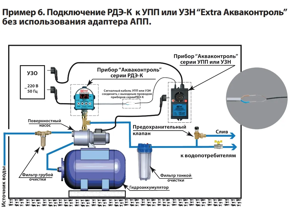Реле давления воды "EXTRA Акваконтроль" РДЭ-К-10-2.2 предназначено для автоматизации работы бытового электронасоса мощностью P1 не более 2.2 кВт, используемого в системах автономного водоснабжения и полива. Реле имеет гальванически изолированные выходы однополюсного нормально разомкнутого электромагнитного реле, что позволяетиспользовать его для управления вторичными устройствами автоматики или для непосредственного размыкания или замыканияцепи питания электронасосов мощностью P1 не более 2,2 кВт. Применение РДЭ-К позволяет управлятьустройствами плавного пуска УПП и устройствами защиты насоса УНЗ "Extera Акваконтроль" без использования адаптера АПП.