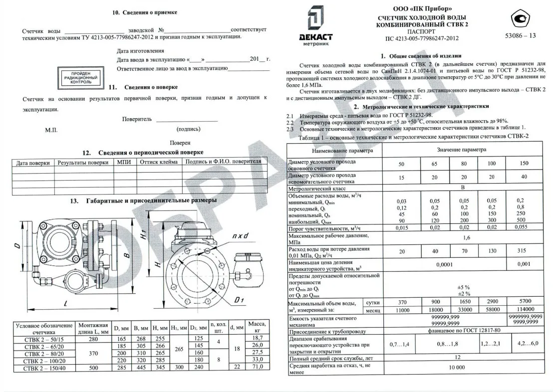 Характеристики товара Счетчик холодной воды комбинированный Ду100 Декаст СТВК 2 10-100-01