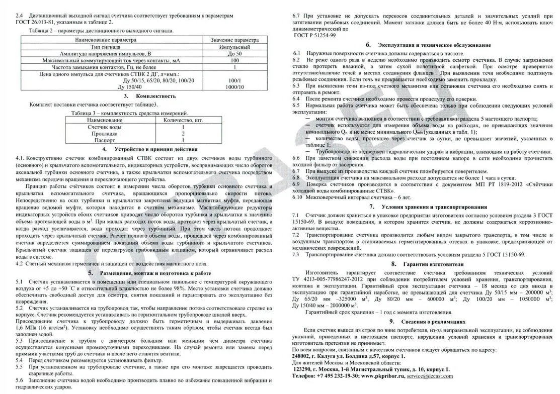 Характеристики товара Счетчик холодной воды комбинированный Ду100 Декаст СТВК 2 10-100-464