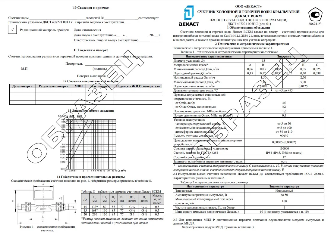 Характеристики товара Счетчик воды импульсный Ду15 Декаст ВСКМ-15 ДГ2 72-15-253