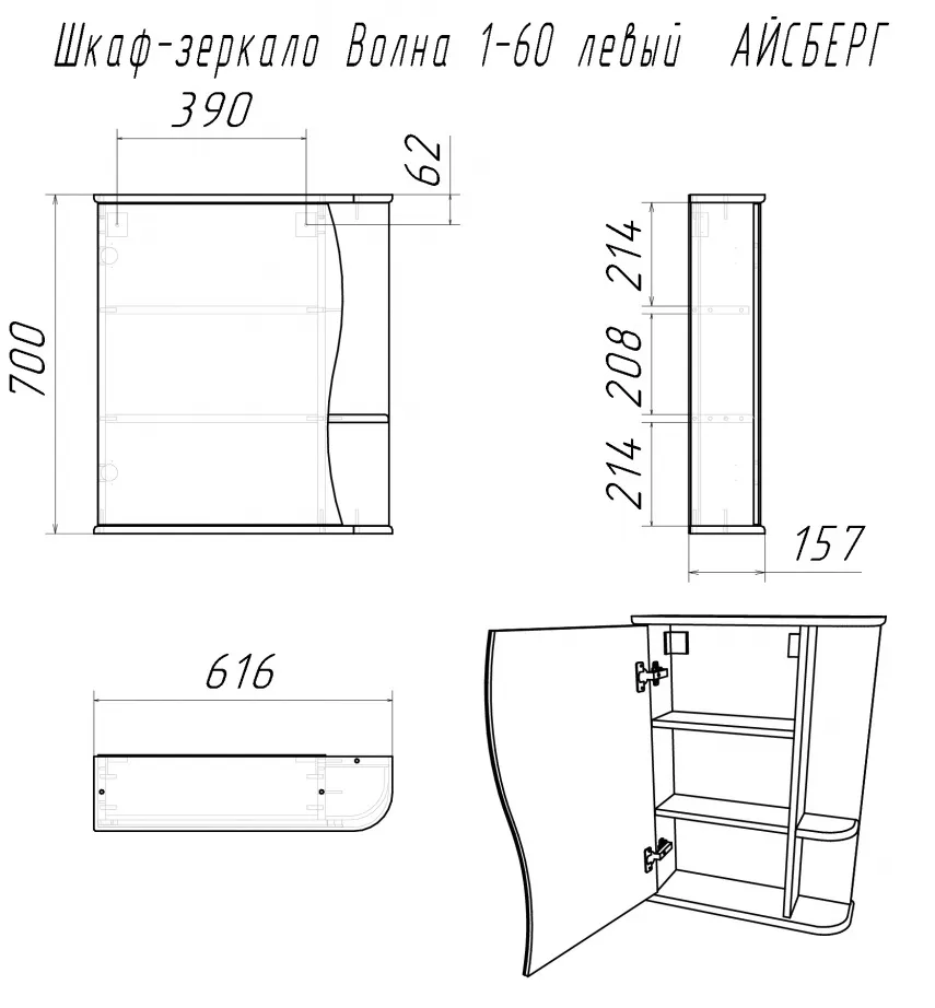Характеристики товара Шкаф-зеркало Айсберг Волна 1-60 L белый DA1034HZ