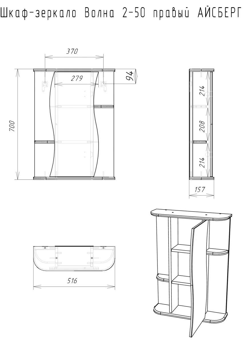 Характеристики товара Шкаф-зеркало Айсберг Волна 2-50 R белый DA1037HZ