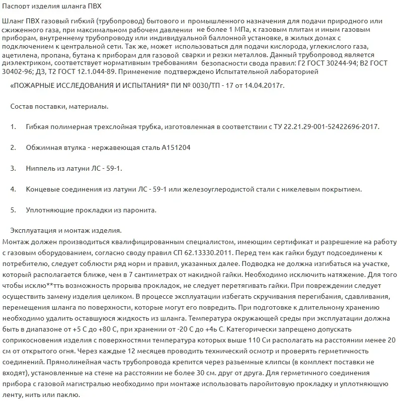 Шланг ПВХ газовый гибкий (трубопровод) бытового и промышленного назначения для подачи природного или сжиженного газа, при максимальном рабочем давлении не более 1 МПа, к газовым плитам и иным газовым приборам, внутреннему трубопроводу или индивидуальной баллонной установке, в жилых домах с подключением к центральной сети. Так же, может использоваться для подачи кислорода, углекислого газа, ацетилена, пропана, бутана к приборам для газовой сварки и резки металлов. Данный трубопровод является диэлектриком, соответствует нормативным требованиям безопасности свода правил: Г2 ГОСТ 30244-94; В2 ГОСТ 30402-96; ДЗ, Т2 ГОСТ 12.1.044-89. Применение подтверждено Испытательной лабораторией