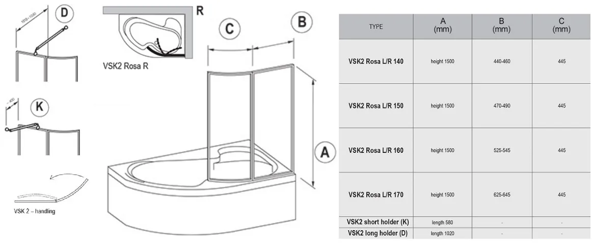 Характеристики товара Шторка на ванну 1400мм прозрачное, матовое стекло Ravak Supernova VSK2 140 P 76P7010041