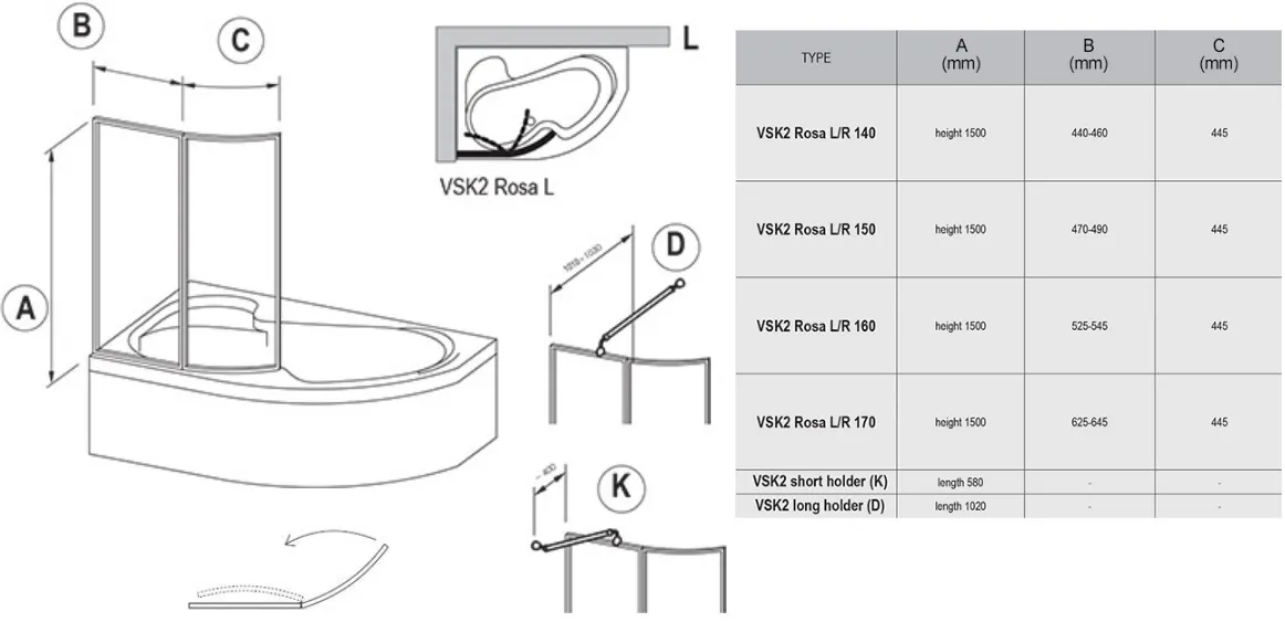 Характеристики товара Шторка на ванну 1700мм прозрачное, матовое стекло Ravak Supernova VSK2 170 L 76LB010041