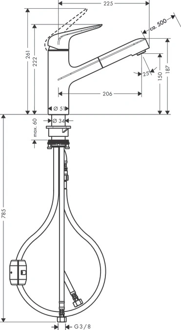 Характеристики товара Смеситель для кухни с выдвижным изливом Hansgrohe Focus M42 150 1jet под сталь 71814800