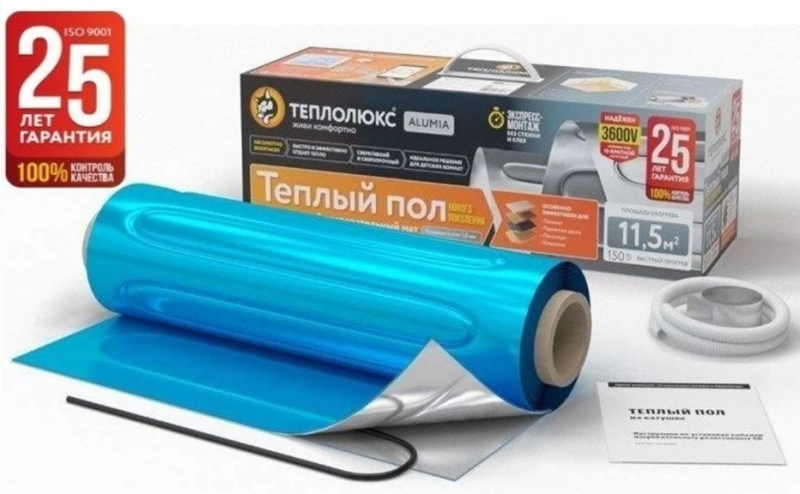 КОМПЛЕКТАЦИЯнагревательный мат на фольге «Теплолюкс» Alumia, трубка монтажная с заглушкой, руководство по эксплуатации, совмещенное с паспортом