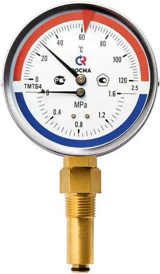 Характеристики товара Термоманометр радиальный Росма ТМТБ-31Р.1 80мм 16 бар 120°С гильза 46мм ½" 00000002330