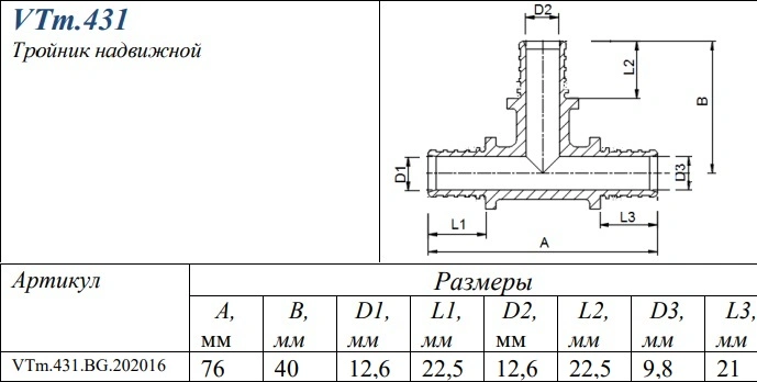 Характеристики товара Тройник аксиальный редукционный 20мм x 20мм x 16мм Valtec VTm.431.BG.202016