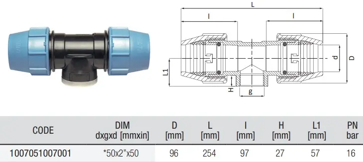 Характеристики товара Тройник компрессионный переходной 50мм x 2"в x 50мм Unidelta 1007051007