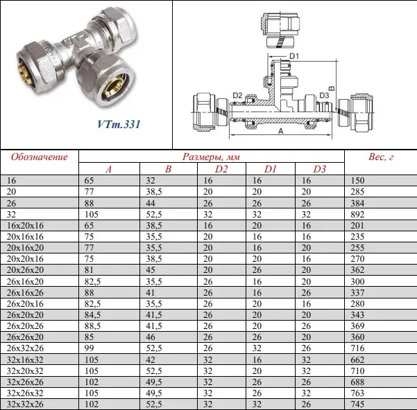 Характеристики товара Тройник компрессионный соединительный 32мм Valtec VTm.331.N.323232