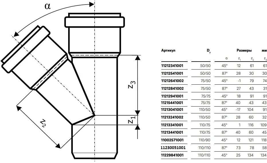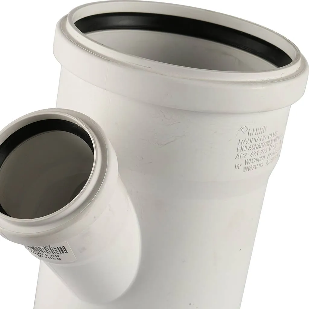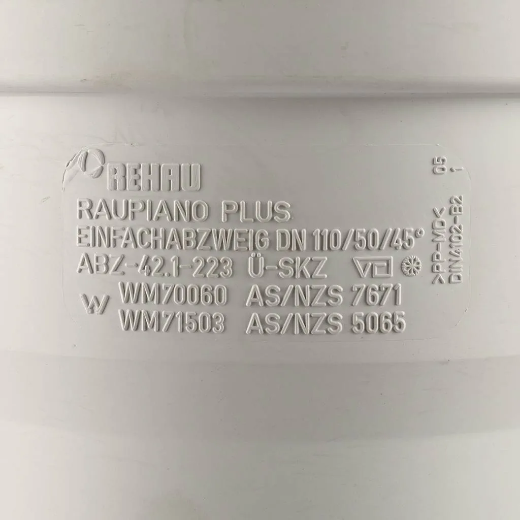 Характеристики товара Тройник внутренний бесшумный D=110x50мм Угол 45° Rehau Raupiano Plus 11213041001