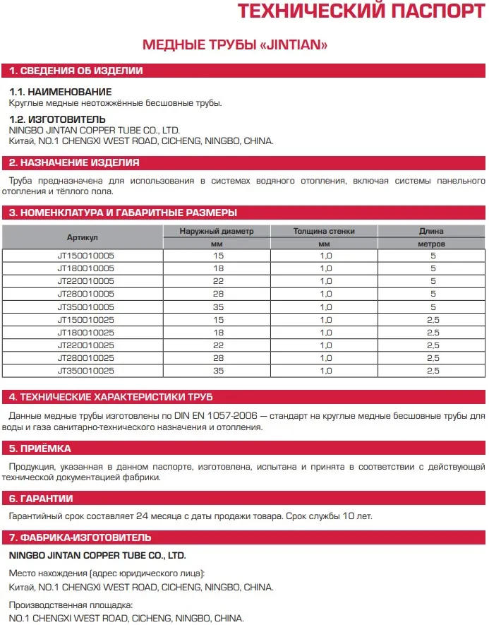Характеристики товара Труба медная неотожженная JINTIAN 18 x 1.0 мм штанга 5м JT180010005