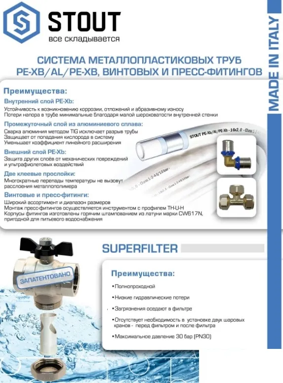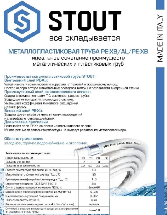 Характеристики товара Труба металлопластиковая Stout 20 x 2.0мм PE-Xb/AL/PE-Xb SPM-0001-102022