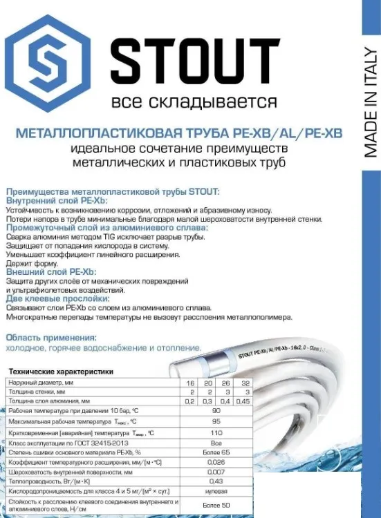Характеристики товара Труба металлопластиковая в теплоизоляции Stout 16 x 2.0мм PE-Xb/AL/PE-Xb 6мм синяя SPI-0002-101620