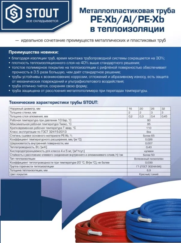 Характеристики товара Труба металлопластиковая в теплоизоляции Stout 32 x 3.0мм PE-Xb/AL/PE-Xb 6мм синяя SPI-0002-053230