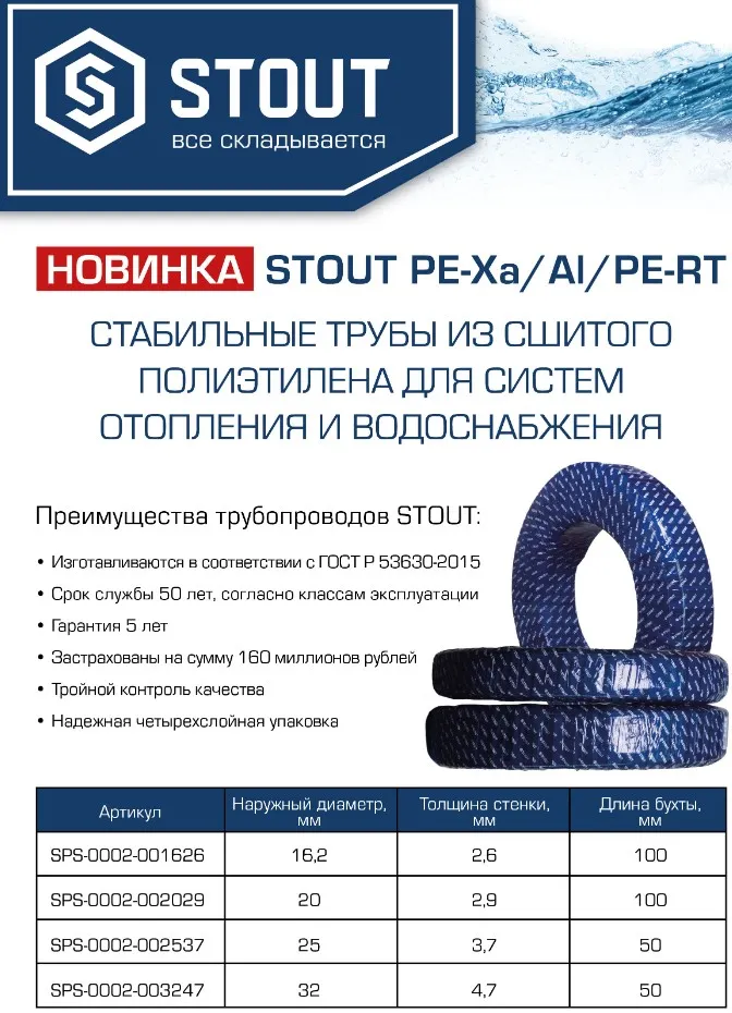 Характеристики товара Труба металлополимерная Stout Stabil 20 x 2.9мм PE-Xa/AL/PE-RT SPS-0002-002029