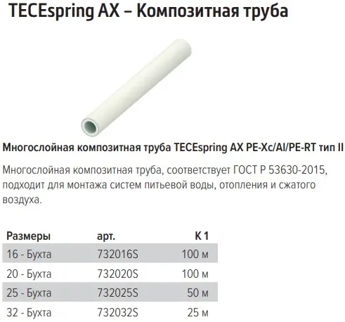 Характеристики товара Труба металлополимерная TECEspring AX 20 x 3.45 мм PE-Xc/AL/PE-RT бухта 100м 732020S