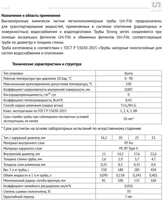 Характеристики товара Труба металлополимерная Uni-fitt Strong series 20 x 2.9мм PE-Xa/Al/PE-RT 554S2010