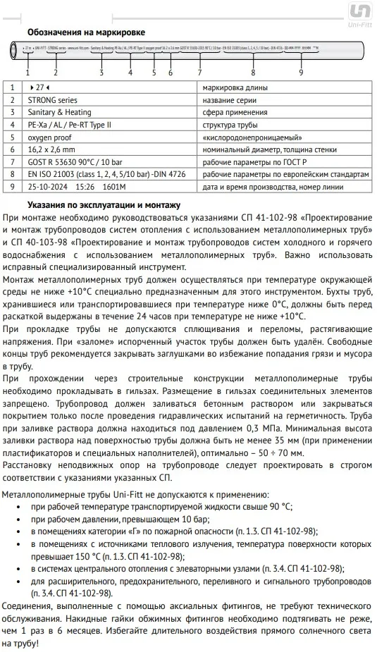 Характеристики товара Труба металлополимерная Uni-fitt Strong series 32 x 4.7мм PE-Xa/Al/PE-RT 554S3225