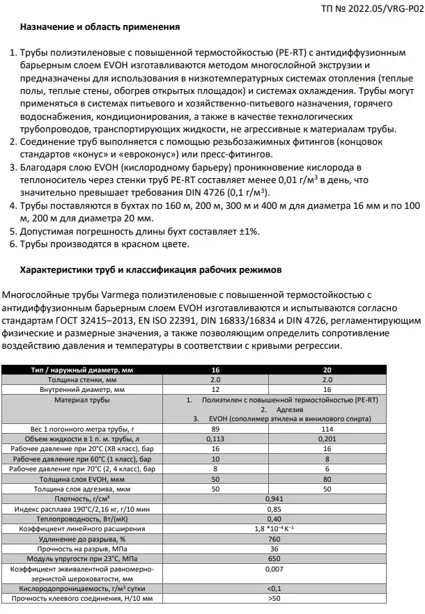 Характеристики товара Труба полиэтиленовая VARMEGA 16 x 2.0 мм PE-RT EVOH бухта 200м VM30301