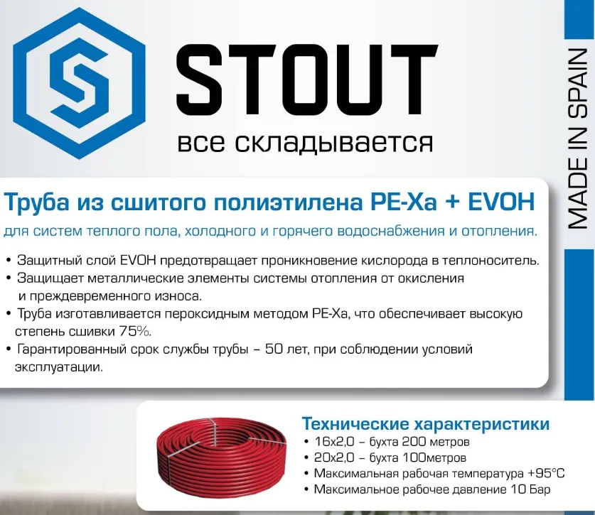 Характеристики товара Труба сшитый полиэтилен Stout 20 x 2.8 мм PE-Xa EVOH бухта 100м SPI-0004-002028