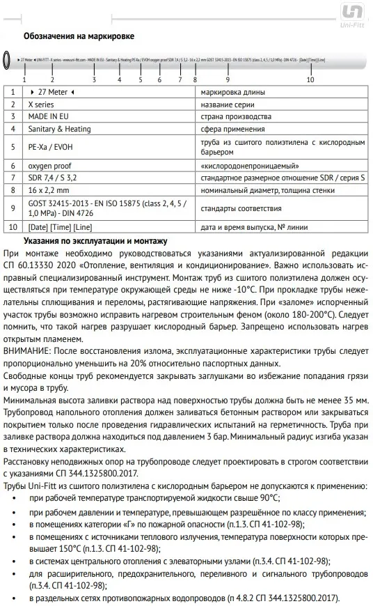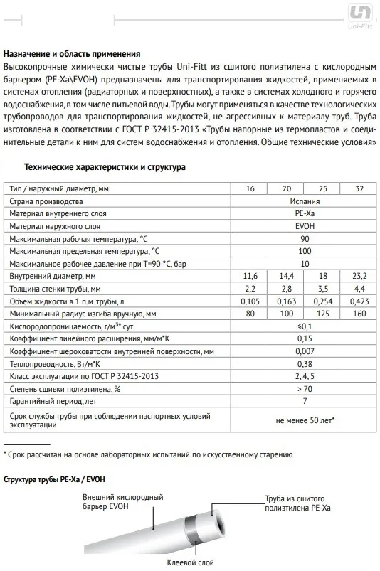 Характеристики товара Труба сшитый полиэтилен Uni-fitt 16 x 2.2 мм PE-Xa EVOH бухта 100м 565X1610