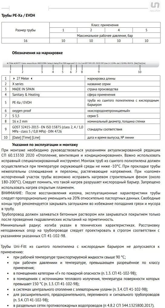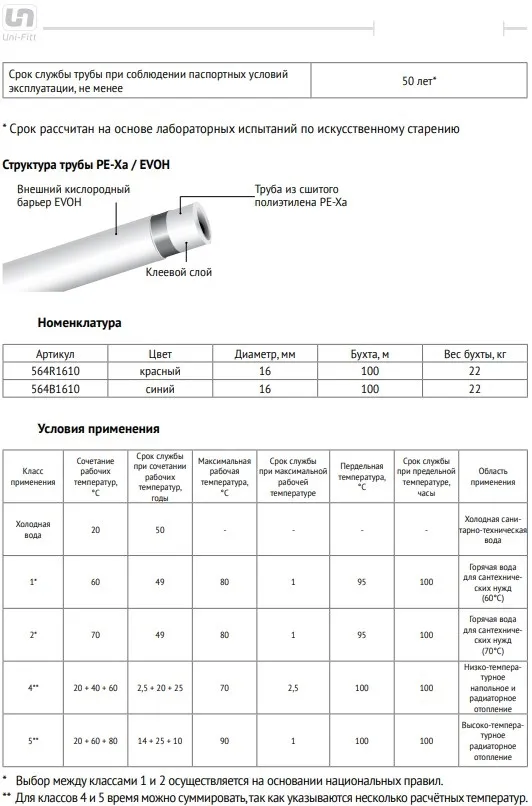 Характеристики товара Труба сшитый полиэтилен в теплоизоляции Uni-fitt 16 x 2.2 мм PE-Xa EVOH 6мм синяя бухта 100м 564B1610
