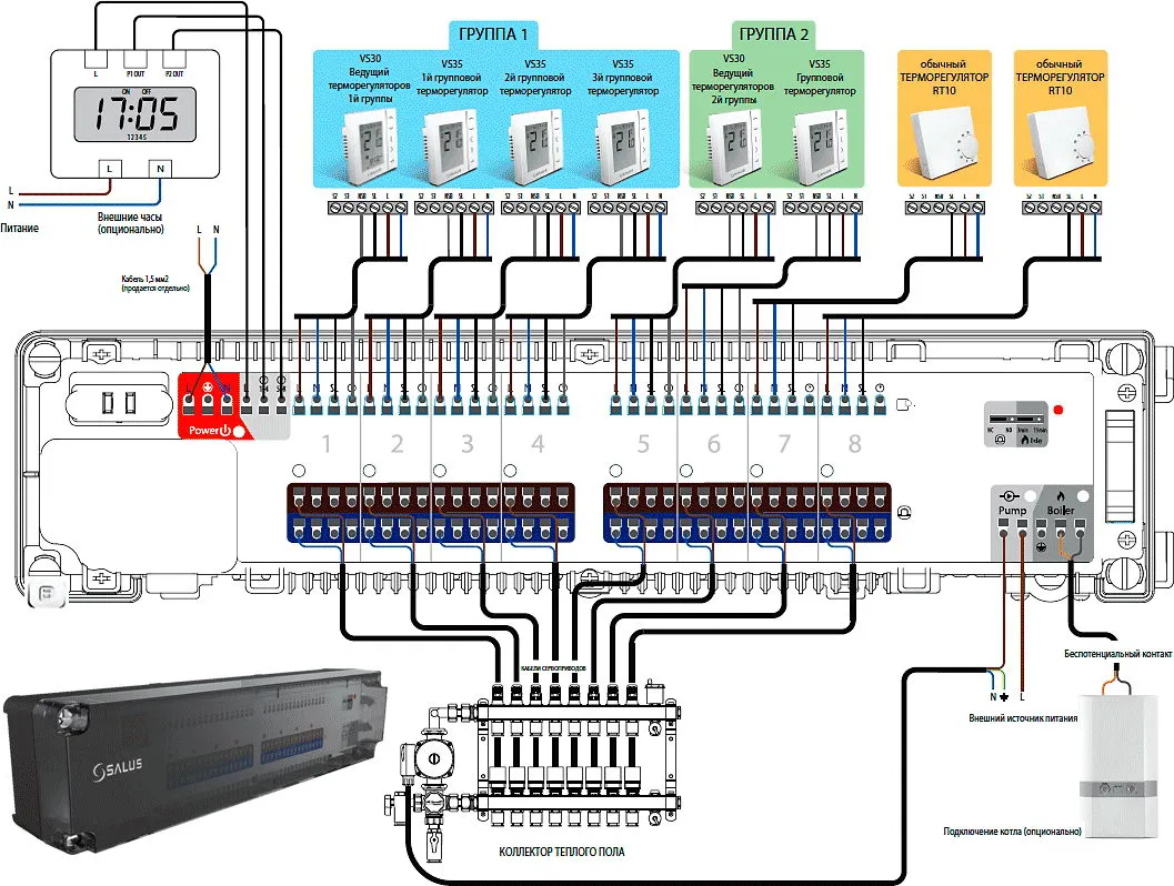 ✔ Возможность подключения 8 терморегуляторов (2 группы по 4 терморегулятора)