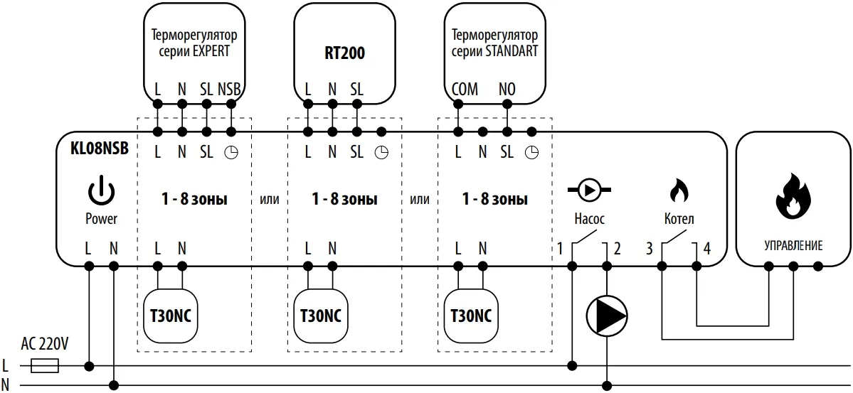 Применение центра коммутации KL08NSB обеспечивает простое и безопасное подключение терморегуляторов и сервоприводов.