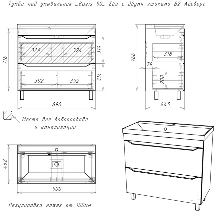 Характеристики товара Тумба под умывальник напольная Айсберг Bazis 90 белый DA5909T